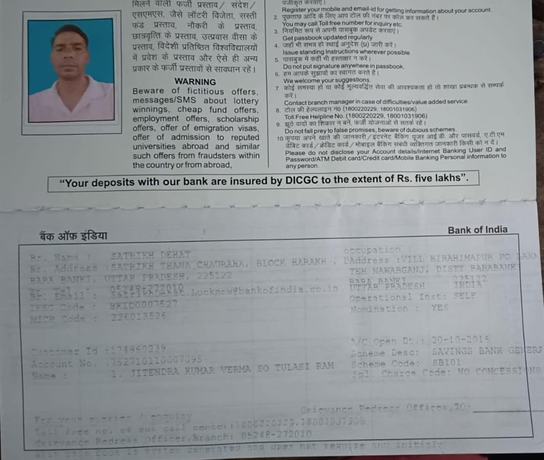 Account Name: Jitendra Kumar Verma Account Number: 752710110007095 IFSC: BKID0007527 Bank Name: Bank of India Bank Address: Satrika Dehat Barabanki Passbook: Download |